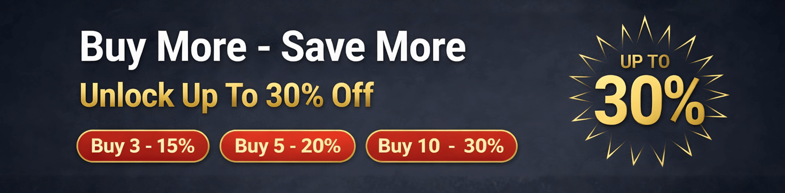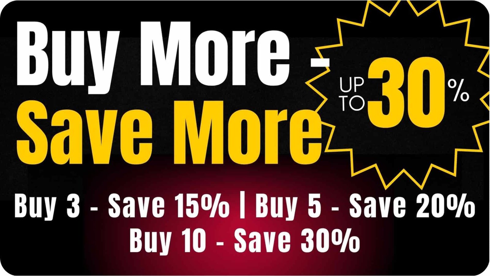 BUY MORE - PAY LESS. Get 3 - save 15%. Get 5 - save 20%. Get 10 - save 30%! Dismiss